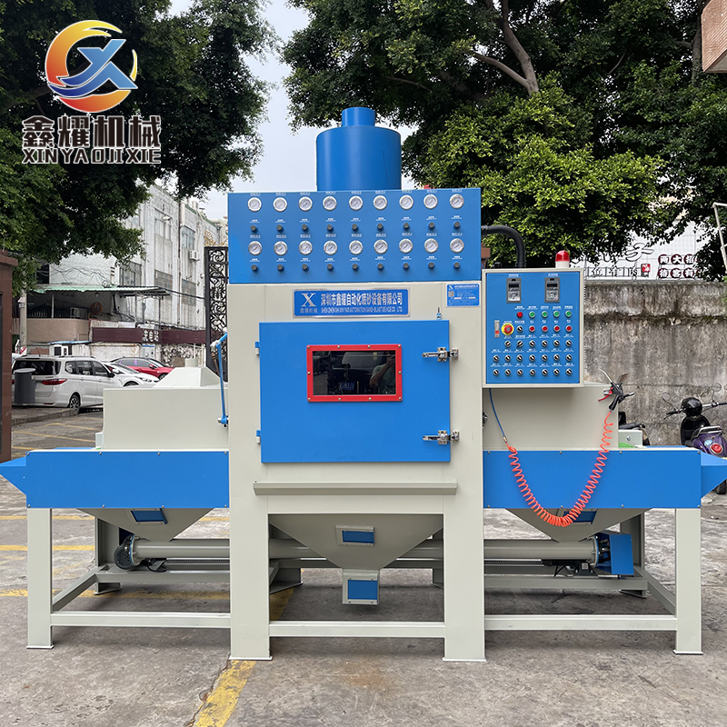 全自动喷砂机在喷砂过程中,产品可直接放置或装在夹具上放入输送带上,匀速通过喷砂室,喷头在电机驱动下随机构作往复摆动喷砂,保证被加工工件表面均匀一致,加工完毕,工件通过吹净室由风批吹净表余砂后由输送线另一端输出。适用喷砂介质:白刚玉、棕刚玉、玻璃砂、陶瓷砂、石英砂、碳化硅、钢砂等砂材。